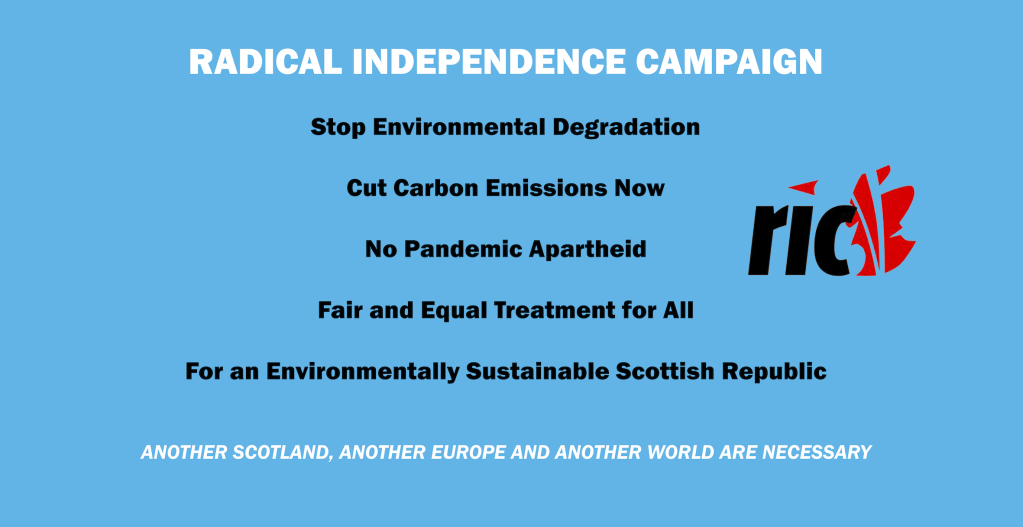 - Mim asked Edinburgh RIC to get national RIC to organise a Scottish independence contingent at the Cop26 demo. We could approach others to organise a joint Left Independence contingent, e.g. RIC, SNP Socialists, Now Scotland, conter, SSP etc. (Nick thought that the Scottish Greens would organise its own contingent)