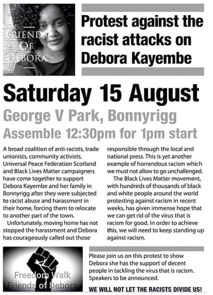 On Sunday 16th August at George V Park in Bonnyrigg in support of Debroa Kayembe’s freedom walk and campaign against racist harassment